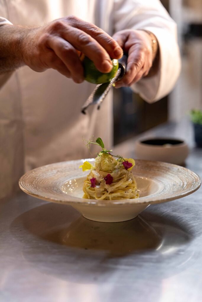 Open for lunch and dinner, seven days a week, the restaurant presents a seasonal Mediterranean menu with Italian influences. Designed as an invitation to travel, it highlights fresh ingredients elevated by Chef Pasquale Lanzilotti.