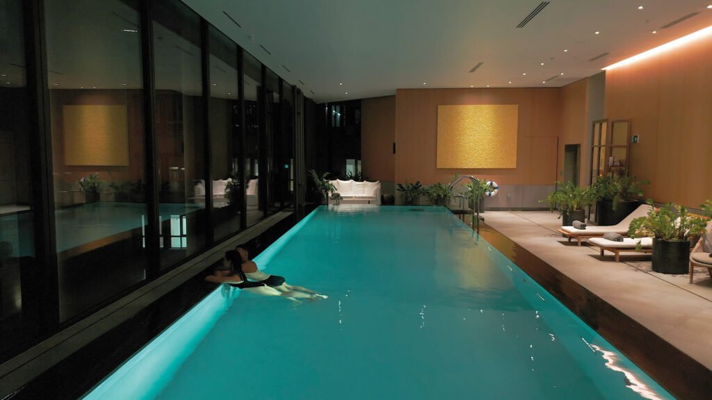 The hotel’s dedicated wellness floor offers an elevated escape. The temperature-controlled 18.5-metre infinity pool is a place where children can play, and adults can float in serene contemplation. Steam rooms, saunas,