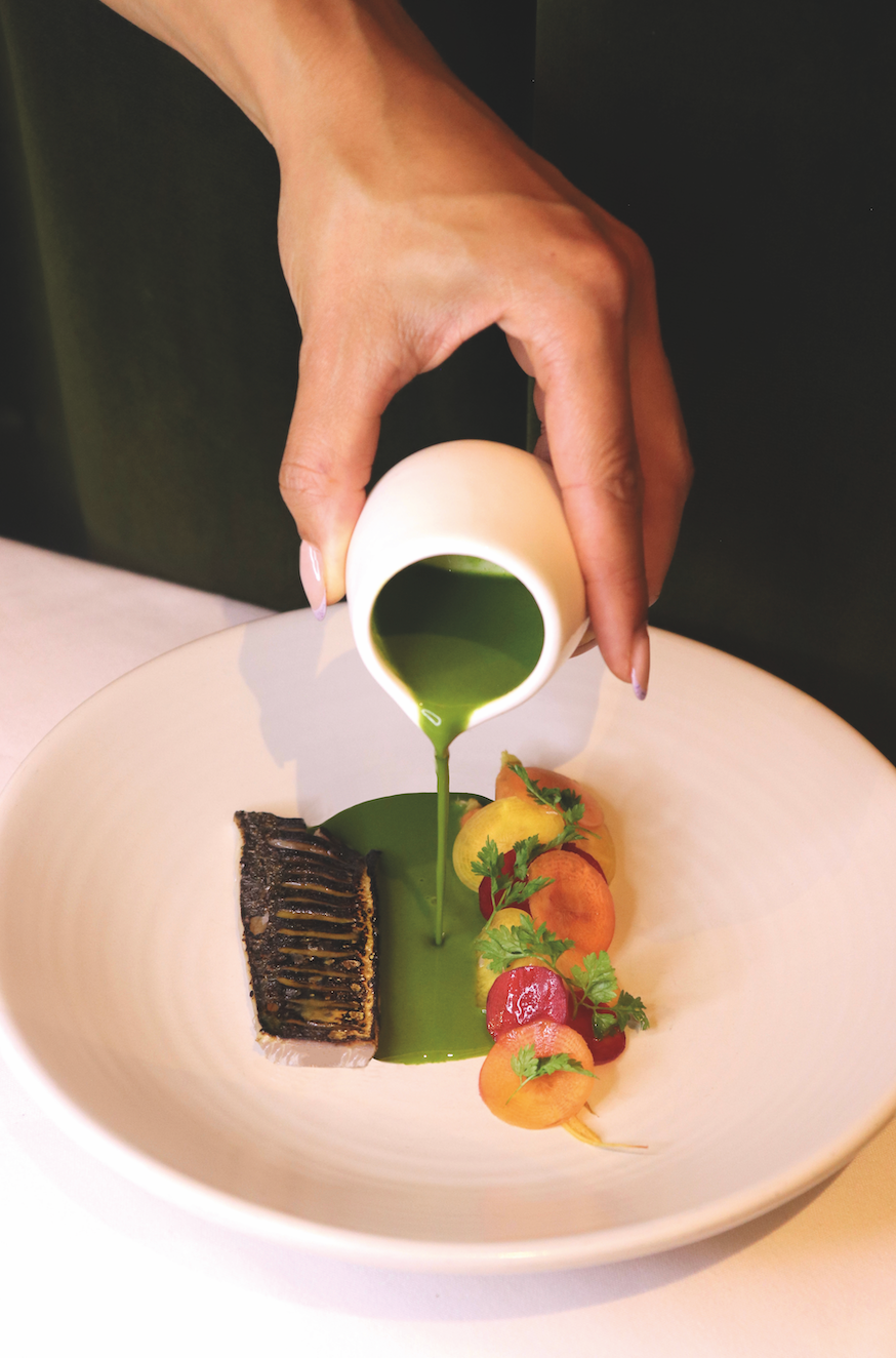 Surrounded by bold Liberty prints and layered fabrics in a warm colour palette of burgundy, pink and green, guests can enjoy signature small plates such as British rapeseed focaccia with whipped marmite butter and torched mackerel with pickled carrot and chervil sauce, alongside larger sumptuous plates of brown butter Chicken Supreme, and wild garlic pearl barley, as well as British Hampshire pork chop and fresh herb salsa verde. Indulgent and filling desserts include a creamy chocolate mousse with preserved cherries.