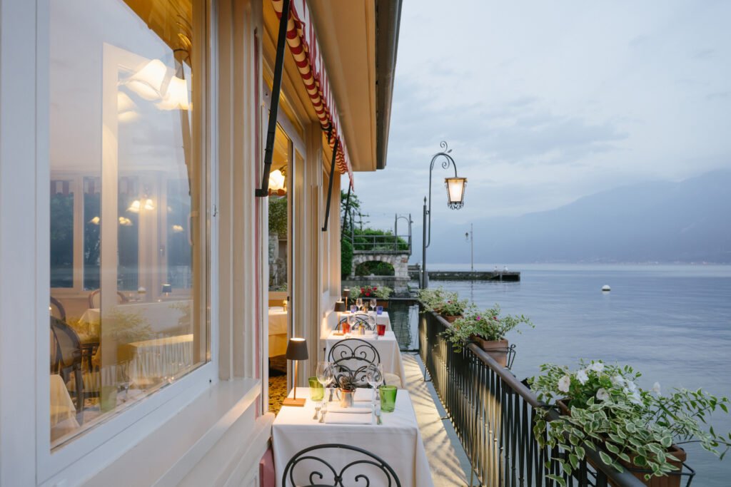 Hotel du Lac (below) is a twelve-room boutique hotel defined by its proximity to the water. The breakfast balcony sits mere inches above the lake surface, allowing for a morning ritual where you listen to the swans and look out at the Monte Baldo range.