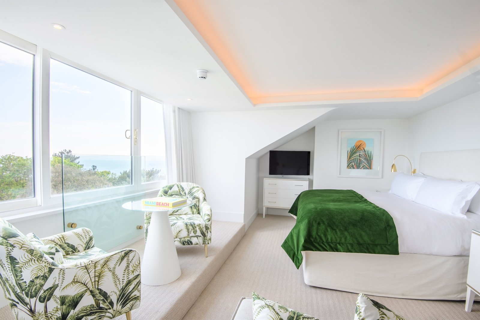 The hotel boasts 88 rooms and suites. Walls are pristine white, punctuated by palm‑leaf motifs and gold accents that nod to Art Deco. Standard doubles feel spacious, with king‑size beds wrapped in crisp linens, big desks, and marbled wet rooms. Upgrade to a suite and you will find freestanding baths, separate living areas and private balconies with sea (highly recommended) or garden views. Some have in‑room hot tubs or retro outdoor sun terraces that rival boutique beach clubs. Even the most modest rooms feel considered with thoughtful touches such as a Nespresso machine, USB charging ports and blackout curtains, ensuring your comfort is never compromised. Also worth highlighting is that The NICI is dog-friendly, so feel free to bring your four-legged family members too.