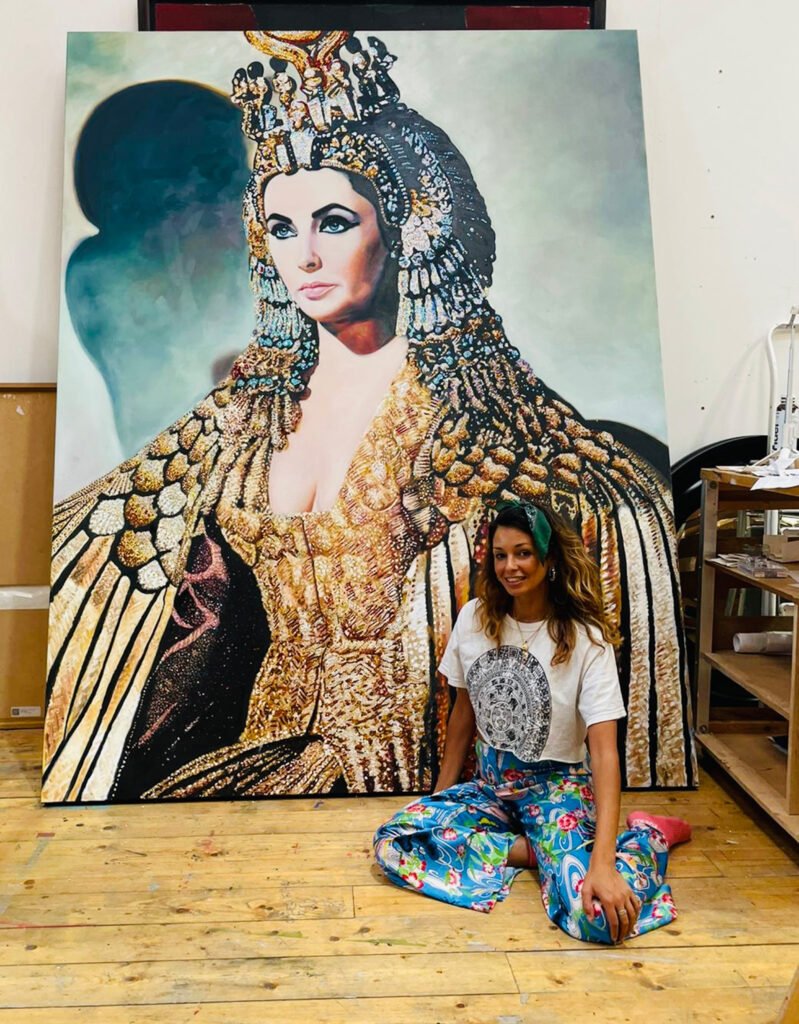 The work celebrates Taylor not only as a cinematic icon but as a symbol of feminine power, resilience and charisma. Inspired also by Irene Sharaff’s award-winning costumes for the film, the piece transforms portraiture into a jewel-like object; a meeting point between fine art, fashion and cultural mythology.