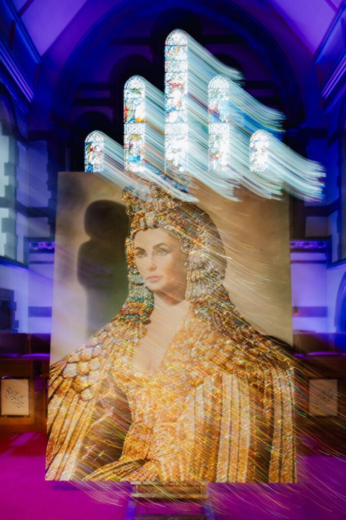 Created in the Summer of 2023, Sequin Kay under the mentorship of (Gerry Kinch) created a unique, visionary and sensational portrait of one of the most iconic women in film history.  The portrait of Elizabeth Taylor as Cleopatra from the 1963 film is an iconic image and has been chosen by both artists to kick start a powerful contemporary art collection.