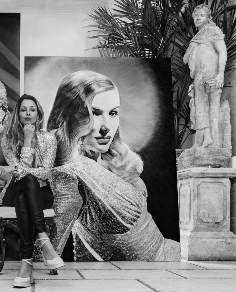 Lake’s life behind the scenes was marked by challenges, including struggles with mental health, alcoholism, and a decline in her career that led to financial difficulties. This stark contrast between her glamorous public image and her troubled private life adds a layer of poignancy to her story.   This crystalled portrait  Lake explores this duality,  juxtaposing her iconic beauty with subtle hints of her inner turmoil, thus offering a more nuanced portrayal of celebrity and the human condition. This duality also reflects the broader narrative of the cost of fame a theme that remains relevant today. Crystal hand-setting is a precise and labour intensive technique it is a meticulous, manual process of arranging individually Swarovski crystals in alignment with the painting to enhance and bring the oil paint to life.