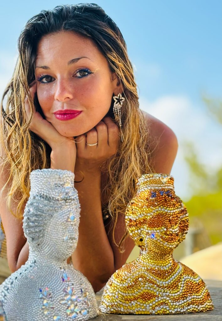 In an era where luxury increasingly seeks meaning beyond material opulence, British artist Sequin Kay represents a compelling evolution of the genre. Working between London and Ibiza, Kay has developed a signature aesthetic that fuses meticulous craftsmanship, symbolic geometry, and the refractive brilliance of Swarovski crystals; into works that operate as both visual spectacle and philosophical inquiry. Her practice repositions luxury not as excess, but as illumination intellectual, emotional and spiritual.