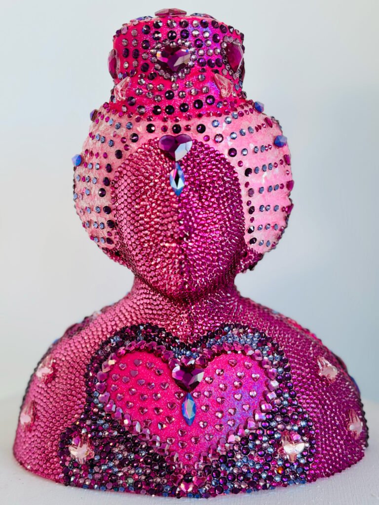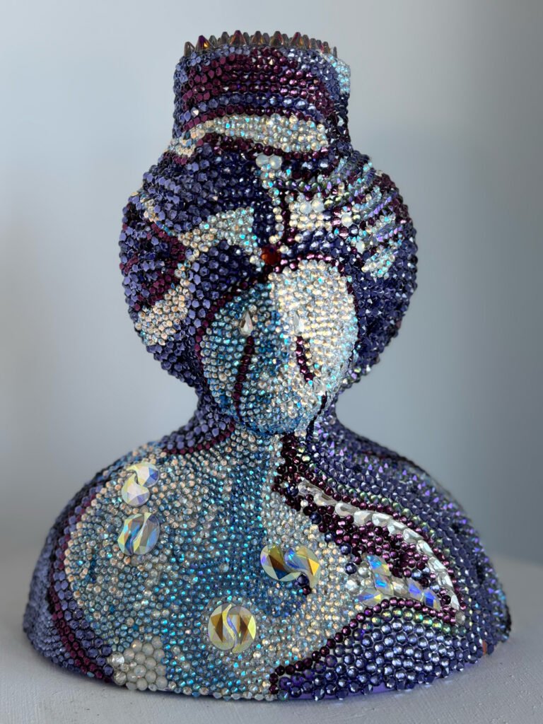In a market saturated with digital replication and fast visual consumption, Kay’s commitment to hand-craftsmanship distinguishes her practice. Each crystal is applied deliberately, creating surfaces that demand time; to make and to behold. This slow luxury echoes the values seen in haute couture ateliers or master watchmaking houses, where labour becomes devotion and detail becomes distinction allowing the artworks to truly radiate and interplay between light.