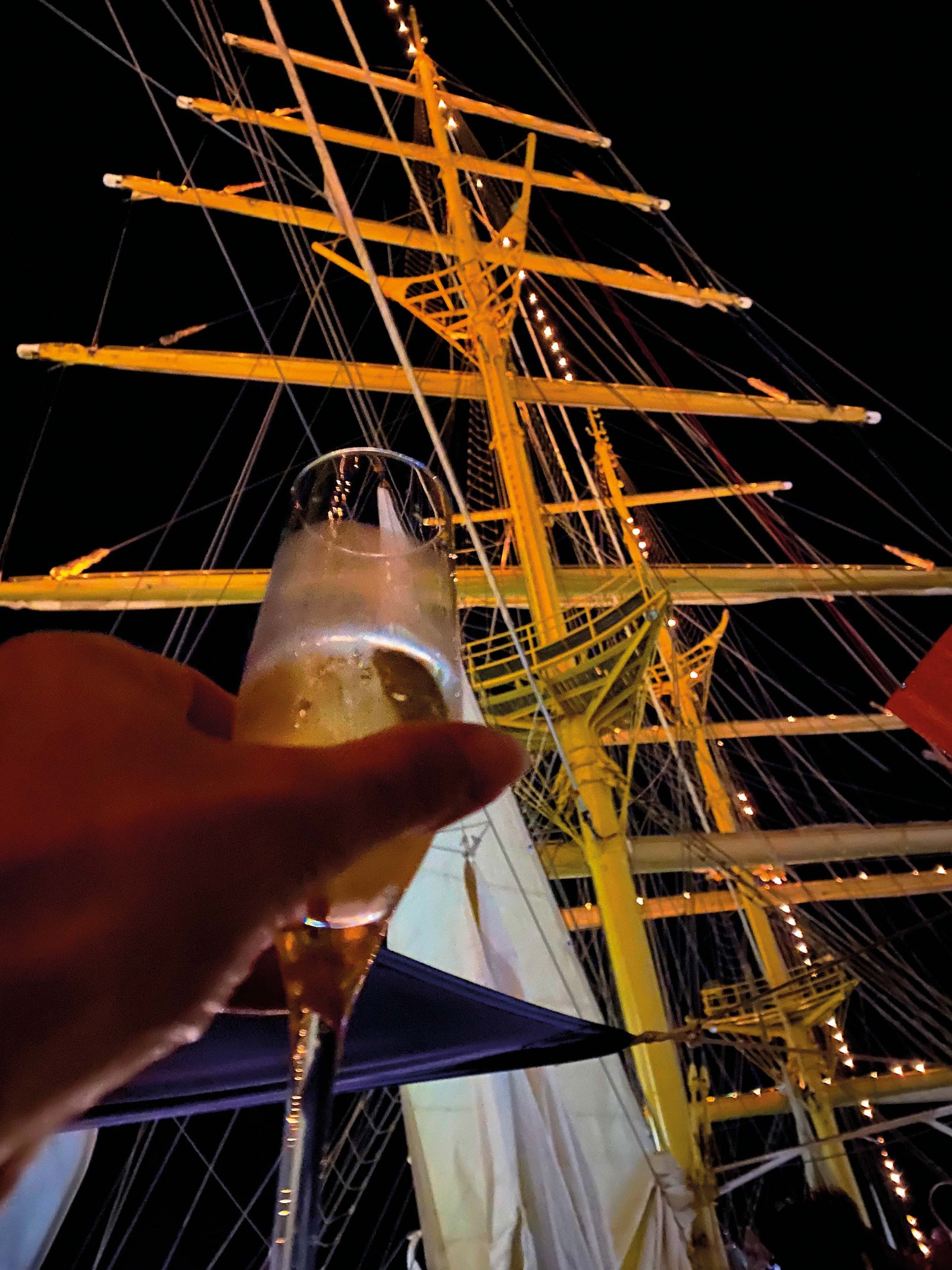 As our voyage from Rome began, the crew began to unfurl the magnificent sails to a soundtrack of Vangelis’s Conquest of Paradise. We fell silent as the sails billowed in the wind, before toasting the ship’s upcoming voyage.