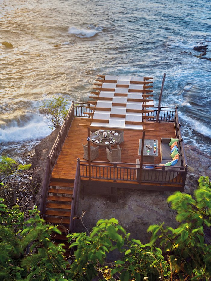 For a truly unforgettable dining experience, Cap Maison’s Champagne Zip Line offers an indulgent twist on romance in the Caribbean. Couples can dine privately on Rock Maison, a secluded wooden deck (above) surrounded on three sides, by the shimmering sea. From the Cliff at Cap – the restaurant suspended above – a bottle of champagne arrives in style, gliding down a zip line straight to your table below. As dusk falls, the setting transforms into something magical. Lanterns and tiki torches cast a warm glow over the ocean, the perfect setting for enjoying a glass of champagne in the ultimate romantic setting.