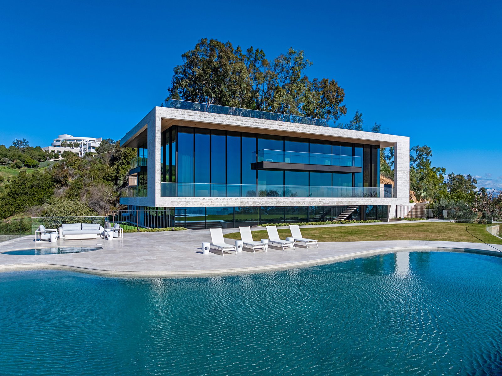On arrival, an imposing grand travertine staircase covered by waffled concrete greets you before you enter the hotel’s triple-height sprawling atrium, complete with a live-music stage and a smattering of swanky restaurants. There is endless marble and dark wood panelling, lavish décor, a baby grand piano, and vast woven artworks hanging on the walls.